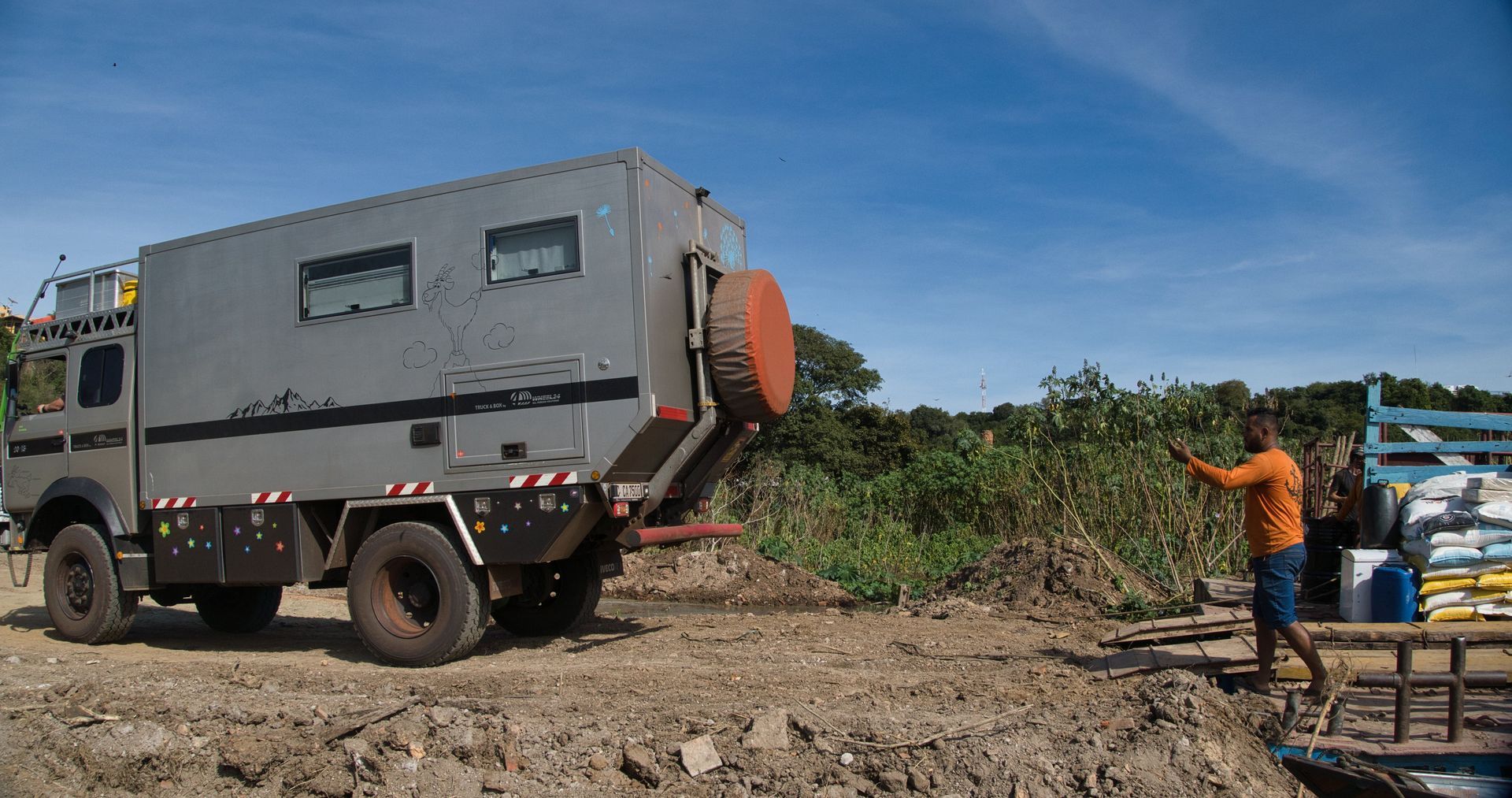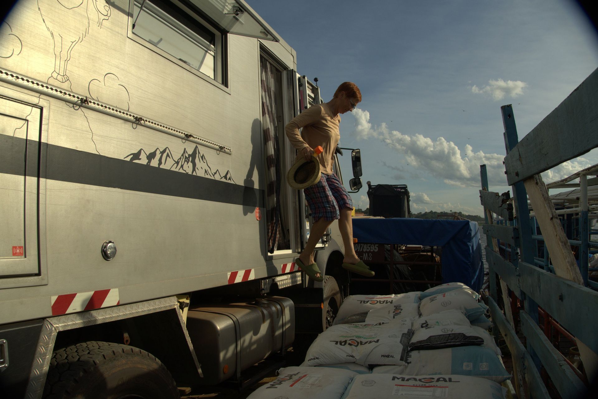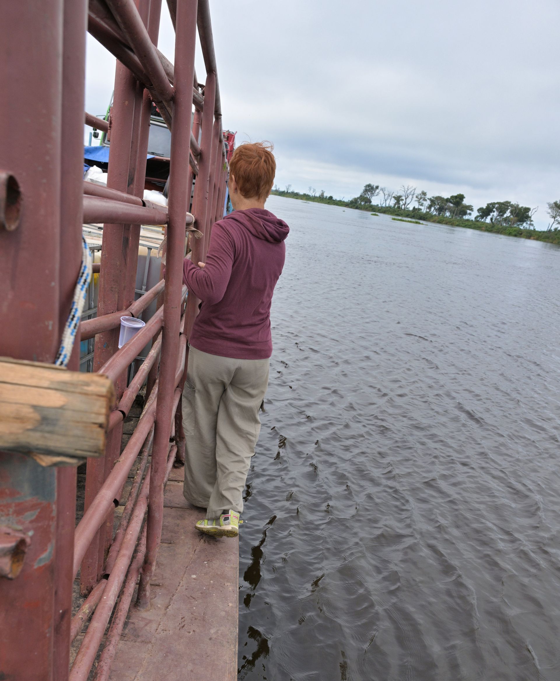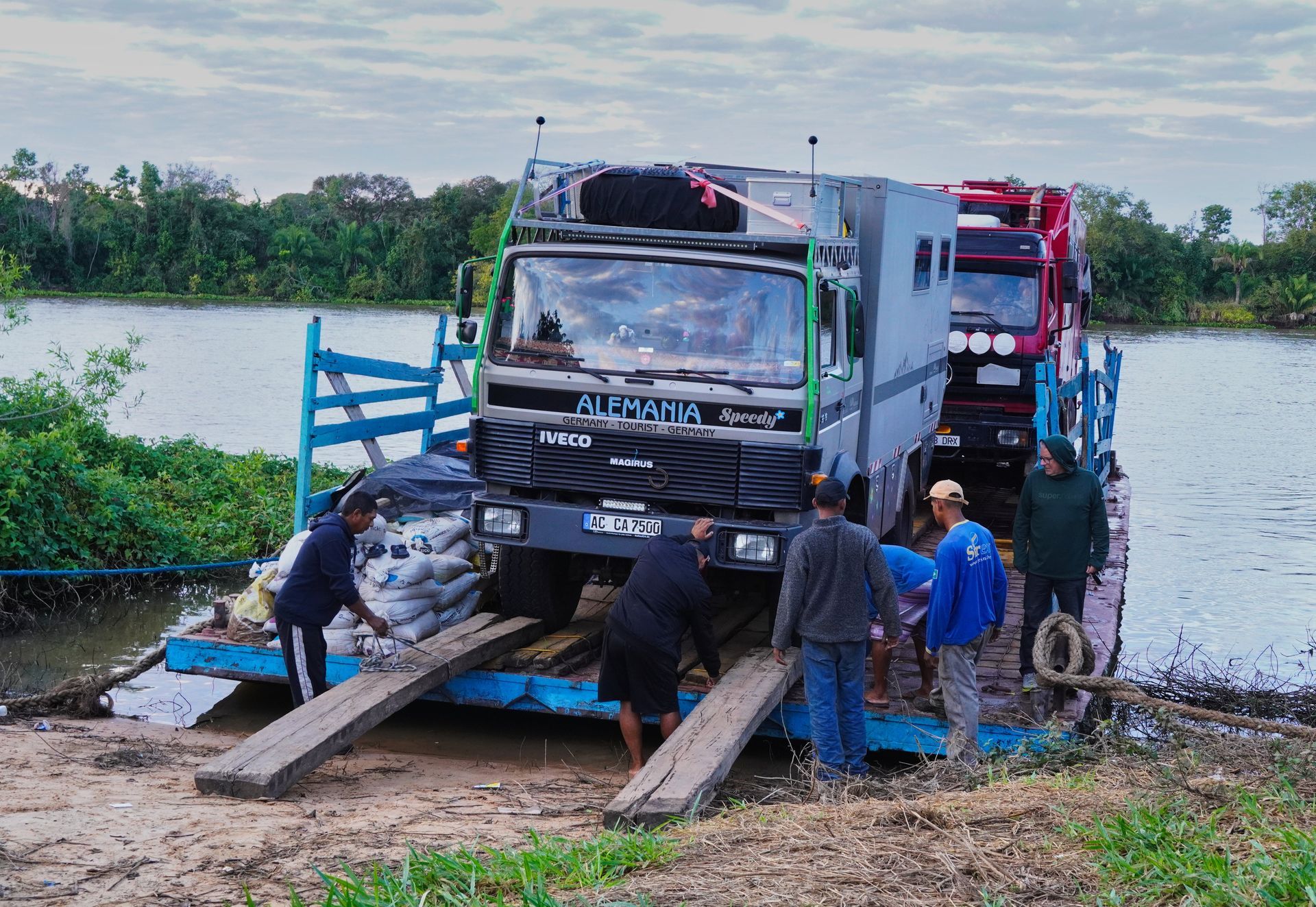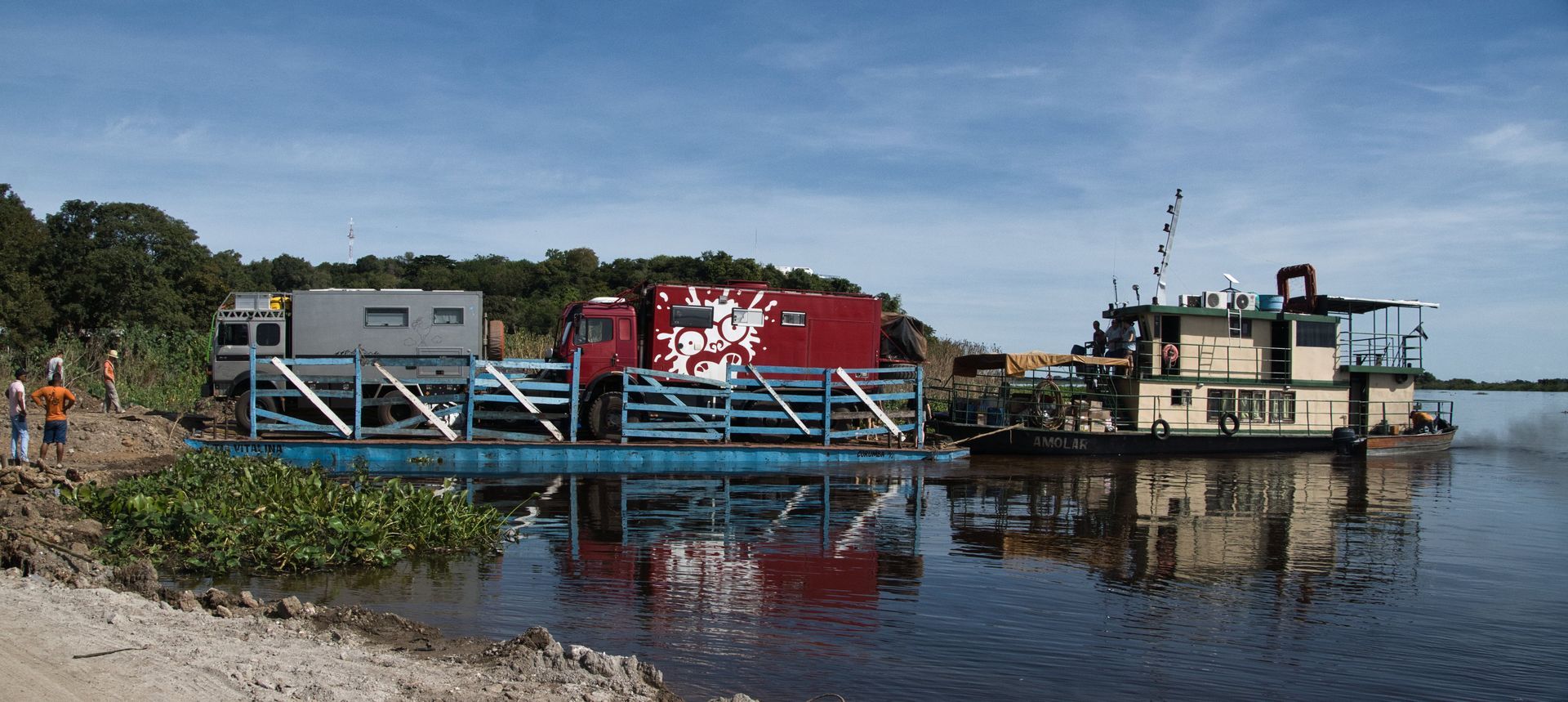 Pünktlich um 08:00 Uhr waren wir dann am Hafen, wobei schon die Anfahrt recht spannend war. Hier standen aber schon zu viele Schiffer an, so dass es zum "Ersatzhafen" ging. Auch hier wenig was auf einen Hafen hindeutet. Lehmboden, etwas angehäuft und einige Spuren. Aber das Team hat es im Griff, ein paarmal hin und her und alle Fahrzeuge waren verladen. In dem anderen Hafen kamen dann noch die anderen Passagier, eine Ziege und jede Menge Proviant für die Fazendas entlang der Strecke dazu. Dieses Ponton ist für einige der am Fluss gelegenen Fazendas die einzige Möglichkeit versorgt zu werden, oder mal in die Stadt zu kommen. Somit sind sowohl Gauchos, als auch Familien mit an Bord.